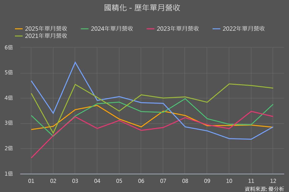 2026年01月22日(優分析/產業數據中心報導)⸺ 國精化(4722-TW) 2025 年 12 月營收為 2.84 億元,年減 24.31%,全年累計營收 37.27 億元,年減 7.75%,顯示短期營收動能仍偏弱。