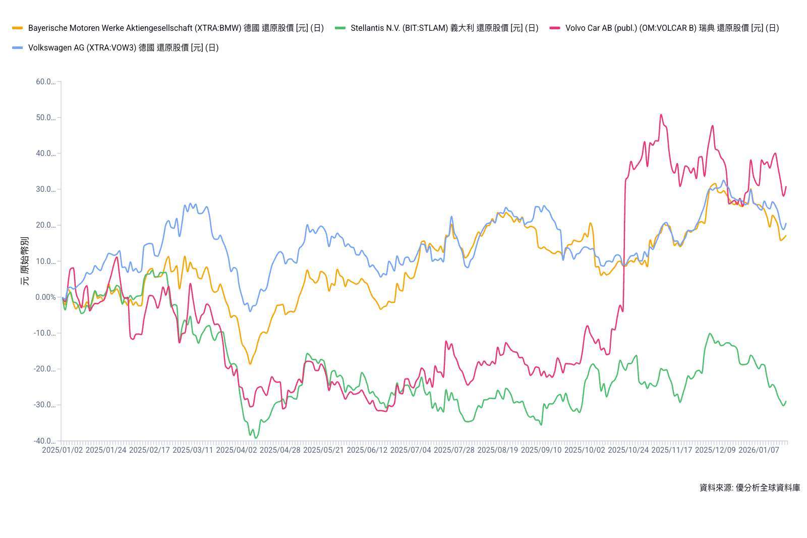 2026年01月22日(優分析/產業數據中心報導)⸺ 德國汽車大廠福斯汽車公布2025年現金流與流動性表現雙雙優於原先財測,加上美國總統川普宣布暫緩對歐洲商品加徵關稅,激勵福斯股價22日歐洲早盤一度大漲5.6%,並帶動整體歐洲汽車類股走強。