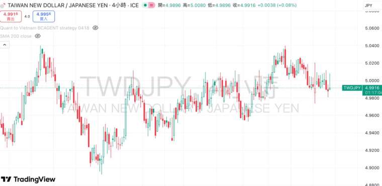 除美元兌日圓外,「高市交易」也明顯反映在台幣兌日圓(TWD/JPY) 走勢上。隨著日圓持續轉弱,台幣相對維持穩定,使台幣兌日圓匯率在 1 月中旬後持續走升。台幣兌日圓 4 小時線在 1 月 19–20 日區間維持於 4.98–5.02 日圓附近震盪,13 日一度觸及 5.03 上方。