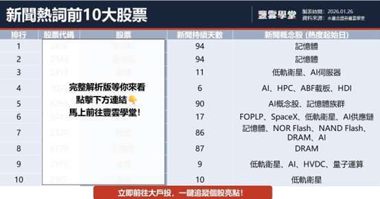 其次,記憶體族群在報價上揚的超級週期下,多頭火種未滅。南亞科 (2408-TW) 處置出關首日即展現強勁吸金力,股價沿 5 日線走揚;群聯(8299-TW) 則因切入企業級 AI 市場,市值大增千億,成為櫃買市場的中流砥柱。然而,投資人需留意個股的籌碼變化,如力積電 (6770-TW) 遭外資大舉調節,股價面臨修正壓力;金寶 (2312-TW) 則因衛星業務暫停而重挫,顯示在題材熱炒下,基本面的變化將直接主導股價走勢。
