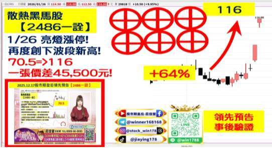 (2486-TW) 一詮,70.5 => 116 領先預告後大漲 +64%,受惠 AI 伺服器與高速網通需求爆發,營運動能明顯升溫,公司公告 12 月營收 5.3 億元,月增 2.2%,2025 年累計營收達 60.5 億元、年增 10.5%,創近 10 年新高,管理層於法說會中指出,將由傳統 LED 導線架廠轉型為 AI 半導體散熱供應商,主打「AI 散熱」與「光通訊散熱」雙主軸,目前已是少數能供應高階先進封裝散熱片的業者之一,並成功打入輝達、Google 供應鏈,訂單能見度上看 2027 年,因應需求擴大,公司已將傳統 LED 產線移往江門廠,釋出國內空間改裝為均熱片與補強片產線,並結合電鍍牌照優勢,積極擴充散熱後製程產能,強化長期成長動能。