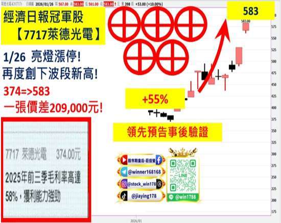 (7717-TW) 萊德光電 -KY,374 => 583 領先預告後大漲 +55%,目前訂單能見度已延伸至 2026 年第一季,並積極布局中紅外線雷射,瞄準太空經濟與衛星雷射通訊的高成長市場,公司成立於 1999 年,總部位於美國西雅圖,核心技術為自研光纖熔融拉錐機台,可生產高精度、高穩定度的合束器等關鍵光元件,應用於光纖通訊、光纖雷射及衛星雷射通訊,具備極高技術門檻,受惠低軌衛星加速部署與雷射光通訊需求成長,萊德成功切入國際衛星供應鏈,隨高毛利產品比重提升,2025 年上半年營收年增逾四成、獲利大幅成長,展望未來,公司將持續強化「光、機、電、軟」垂直整合,朝全球太空雷射通訊關鍵供應商邁進。