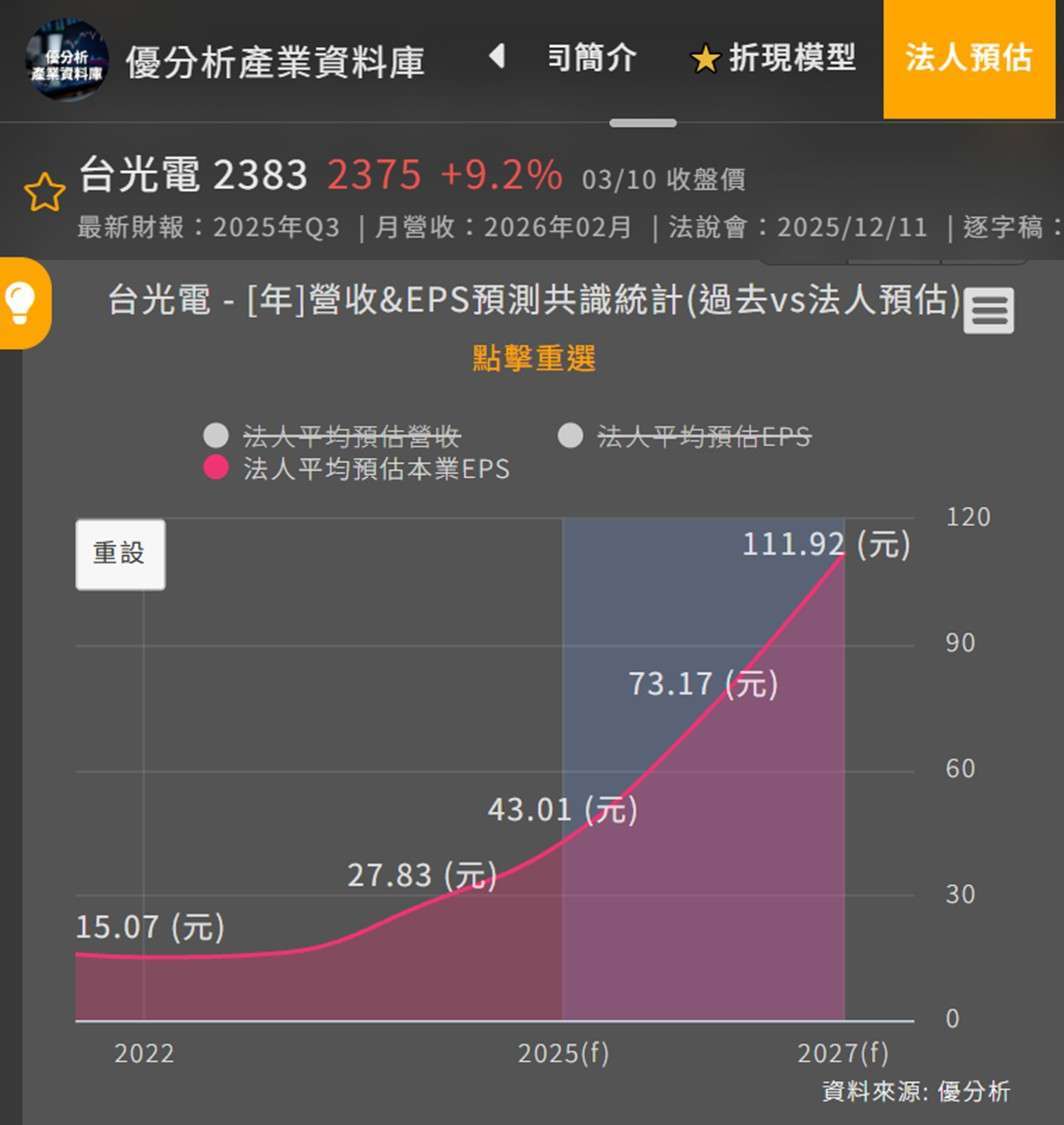 廖婉婷分析,市場普遍預估台光電(2383-TW)今年 EPS 落於 70 到 80 元,明年更有望挑戰 90 到 100 元的驚人水準。若未來戰火平息、油價回落,總體經濟重回「降息與資金寬鬆」的軌道,在 AI 高成長的作夢行情加持下,市場給予 30 倍的本益比(PE)並非不可能。