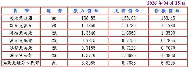 隨著國際貨幣基金組織 (IMF) 預計 BOJ 逐步提高利率速度較六個月前預期略快,激勵日圓上漲;此外,芝加哥聯邦儲備銀行總裁古爾斯比警告持續通貨膨脹可能延遲美國聯邦準備理事會 (FED) 至明年降息,但美國財政部長貝森特相當有信心核心通貨膨脹繼續回落,再呼籲 FED 降息,並據美國公布 3 月最終需求生產者物價指數 (PPI) 分別較前月與去年同期漲 0.5% 及 4.0% 低於預期,全美獨立企業聯盟 (NFIB) 則表示 3 月美國小企業信心指數降至十一個月最低 95.8,而且美國與伊朗可能未來兩天重啟談判,樂觀的情緒削弱美元,兌日圓跌至 158.59 低點。預估今日美元兌日圓阻力於 158.80-159.0,支撐於 157.70-90。