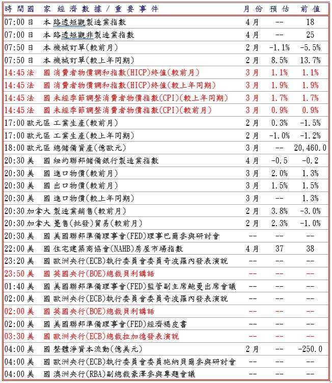 週二英國零售業聯盟 (BRC) 調查 3 月零售銷售較去年同期成長 3.6%,但消費者支出較上年同期增幅降至 0.9%,而且 IMF 下調英國今年經濟增長至 0.8%,打擊英鎊兌美元至 1.3488 低點。隨後英國央行 (BOE) 利率制定者格林稱,若能源成本上升傳導至工資及其他商品和服務價格,BOE 將不得不上調利率,而且寄望中東衝突解決改善風險偏好,推升英鎊兌美元至 1.3589 高點。預估今日英鎊兌美元支撐於 1.3540-60,阻力於 1.3640-60。