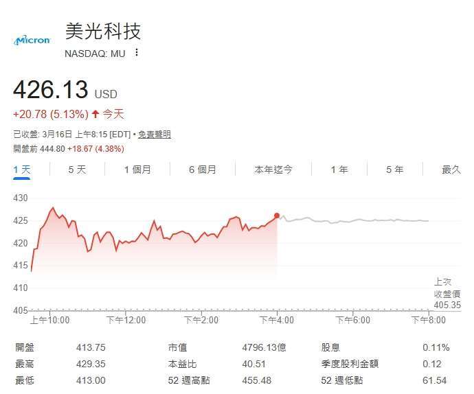 截稿前,美光 (MU-US) 美股盤前股價上漲 5.13%,每股暫報 426.13 美元,成為標普 500 指數盤前漲幅最大的成分股之一。