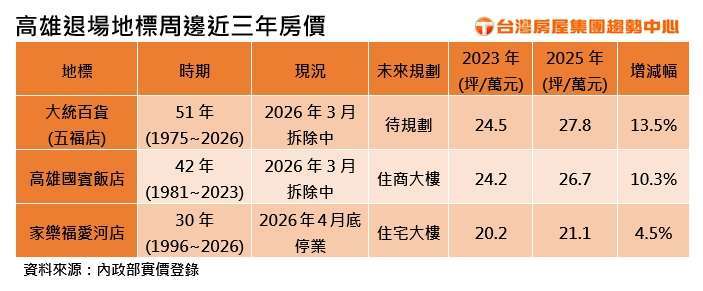 繼高雄國賓飯店與大統百貨五福店接連退場,位於愛河特區、營運約 30 年的家樂福愛河店,近期也公告因租約到期,將於 4 月底結束營業未來將轉型為景觀住宅大樓。根據台灣房屋集團統計,家樂福愛河店與已啟動拆除重建的高雄國賓飯店,兩大地標周邊近三年房價均落在 2 字頭,且呈小幅上揚走勢。